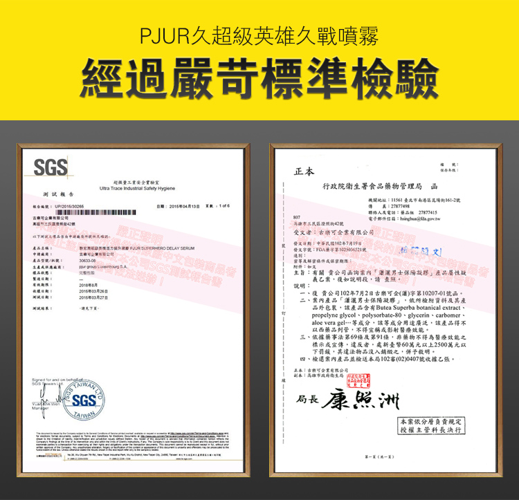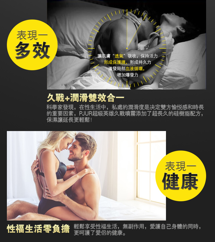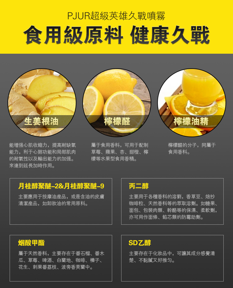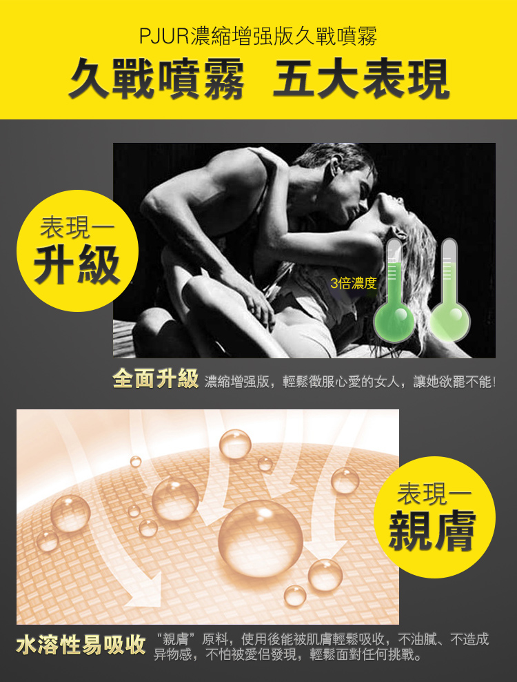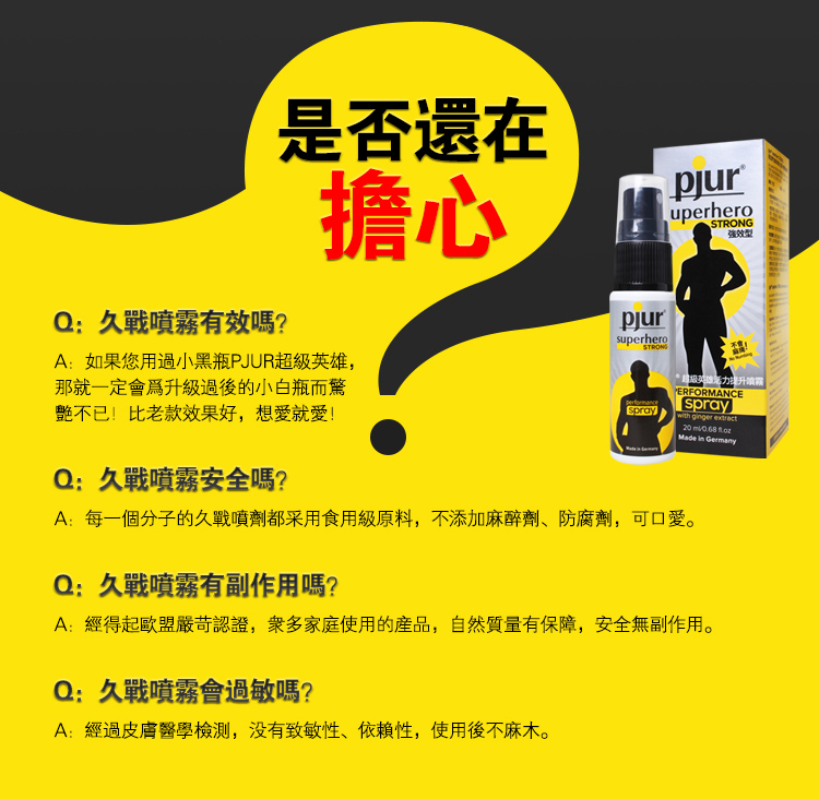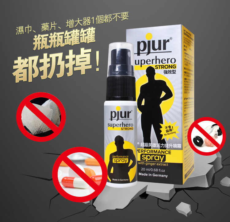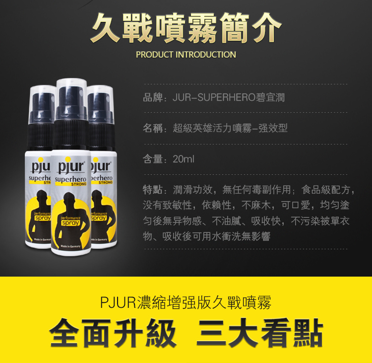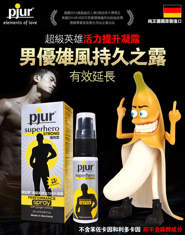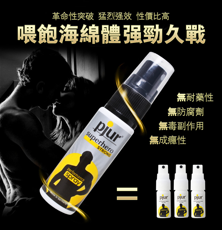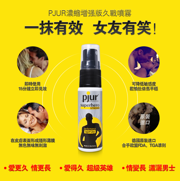 市面上一般增強持久力的產品普遍都使用麻醉劑如苯坐卡因(Benzocaine) 及/或利多卡因(Lidocaine)等成份。但 pjur® superhero 能力增強噴霧使用德國製造之有效成份 Laureth-4。此成份有效減低皮膚的敏感度之餘同時有別於麻醉劑,不會積聚於人體內,實為更安全之成份。