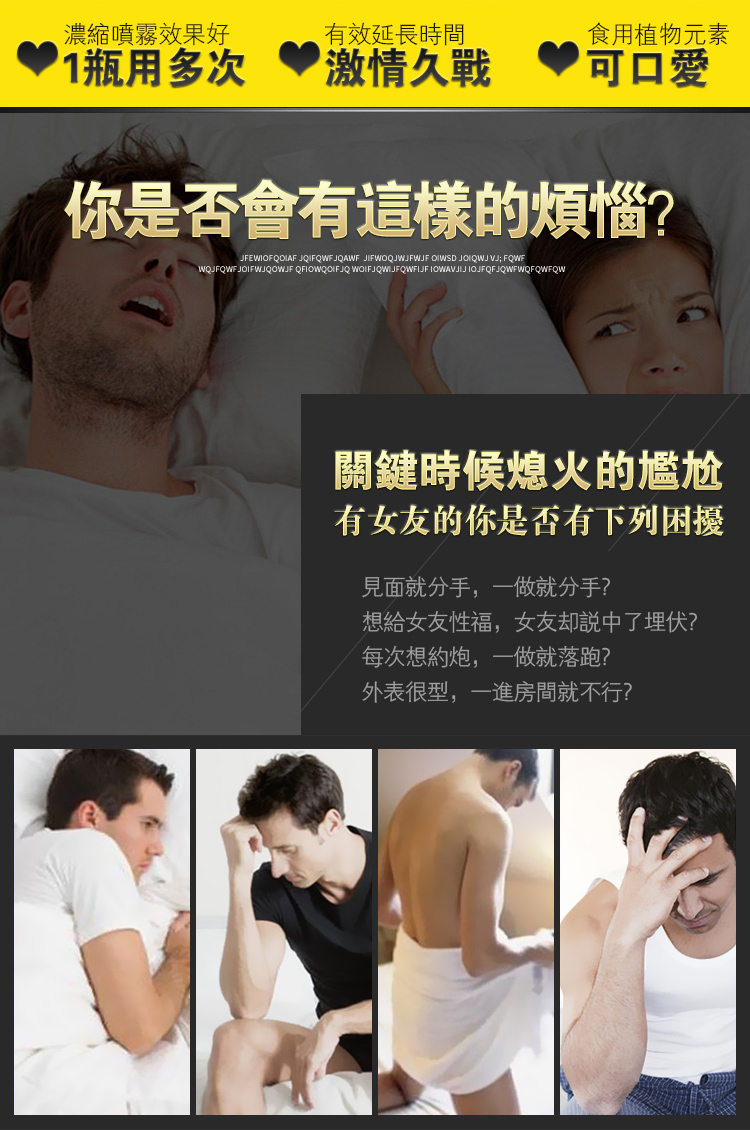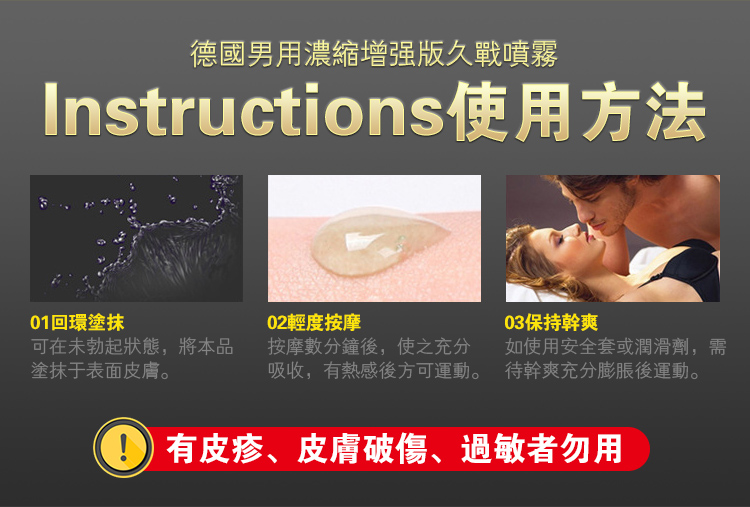 為保障使用時有機會的不適感,請先噴灑少量噴霧於手臂作測試。如出現過敏反應,請即停止使用並用清水沖洗該部位的皮膚。本產品於使用時可能會降低精子活躍性,若有意受孕者,請於使用前諮詢醫護人員的意見。本產品不含殺精劑,無避孕效果。亦不是潤滑劑,但可與其他潤滑劑一同使用。本產品不含苯坐卡因及/或利多卡因,適合每天安全使用。不可用於傷口及眼睛位置。請勿讓小童接觸此產品。可與乳膠製品同時使用。有勃起困難者不適用,只適合關注耐力人士使用。只供外用,不可口服。